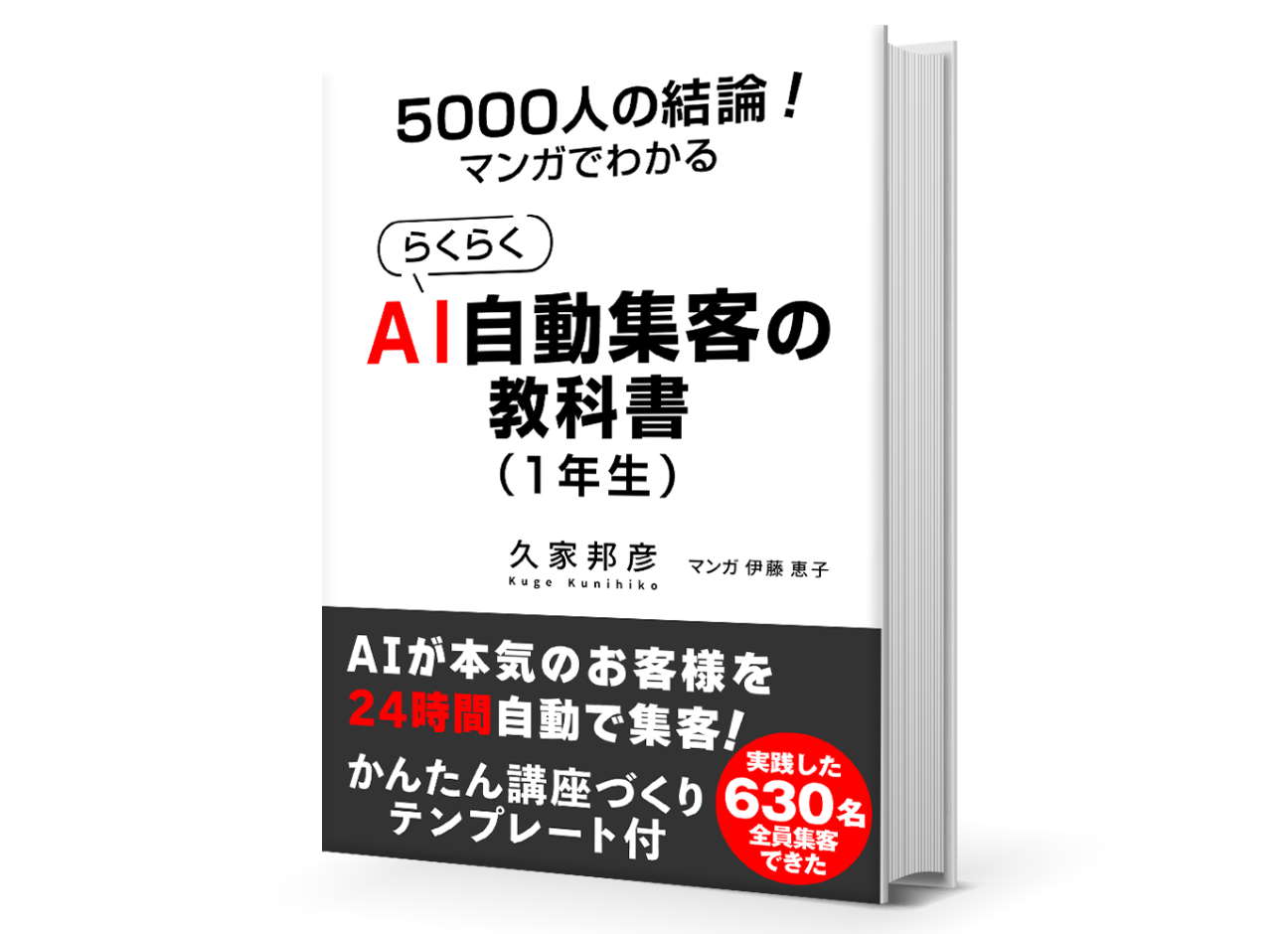 | 書籍『らくらくAI自動集客の教科書』 | 無料 | なぜ、9割の人がチャットGPTを活用して集客できないのか?その3つの理由と、解決策を提示します。 |